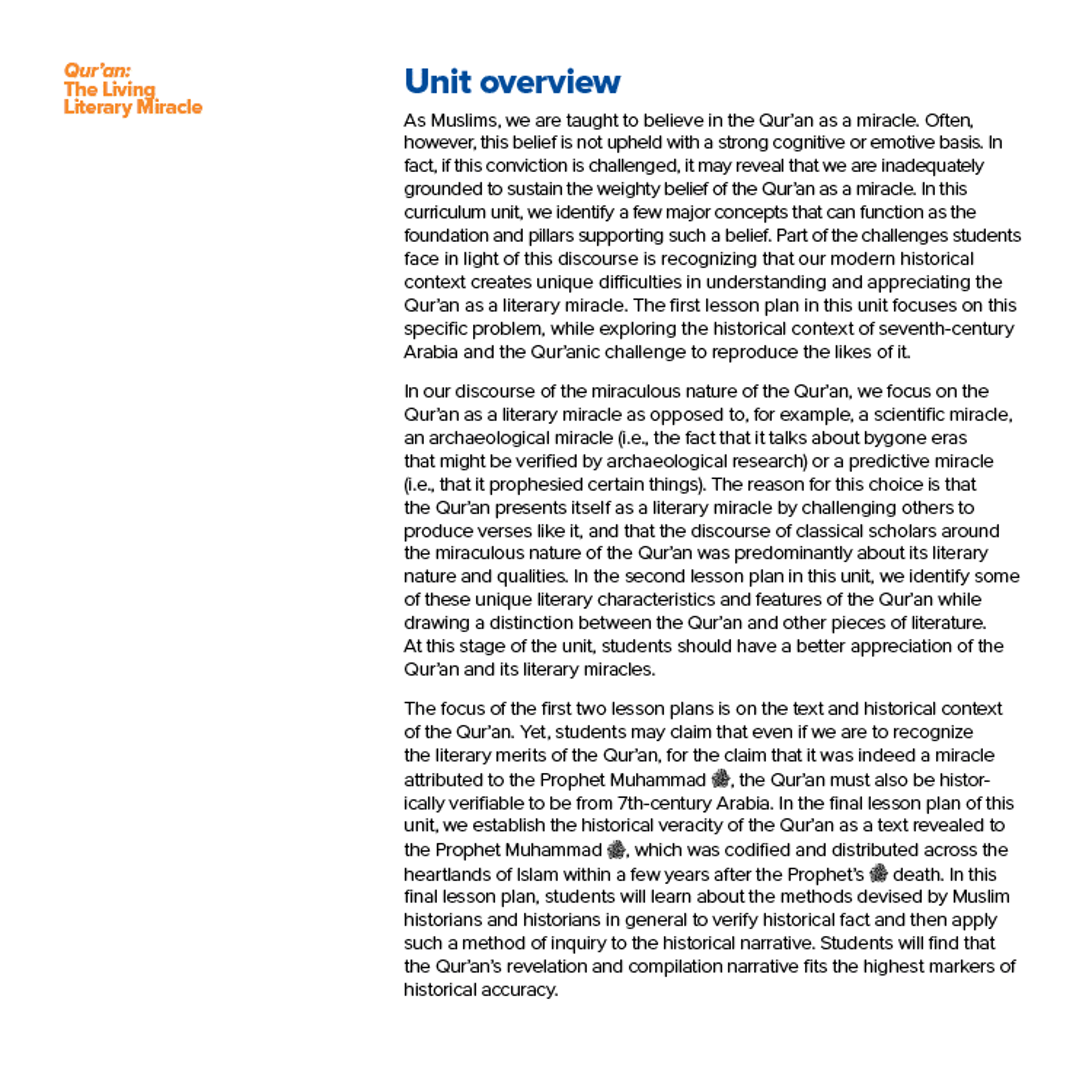 Students will explore how the Qur’an is and will continue to be a living, literary miracle until the end of time. This lesson explores this claim on three bases: the historical circumstances of its revelation, its internal structure, and its substantive material.